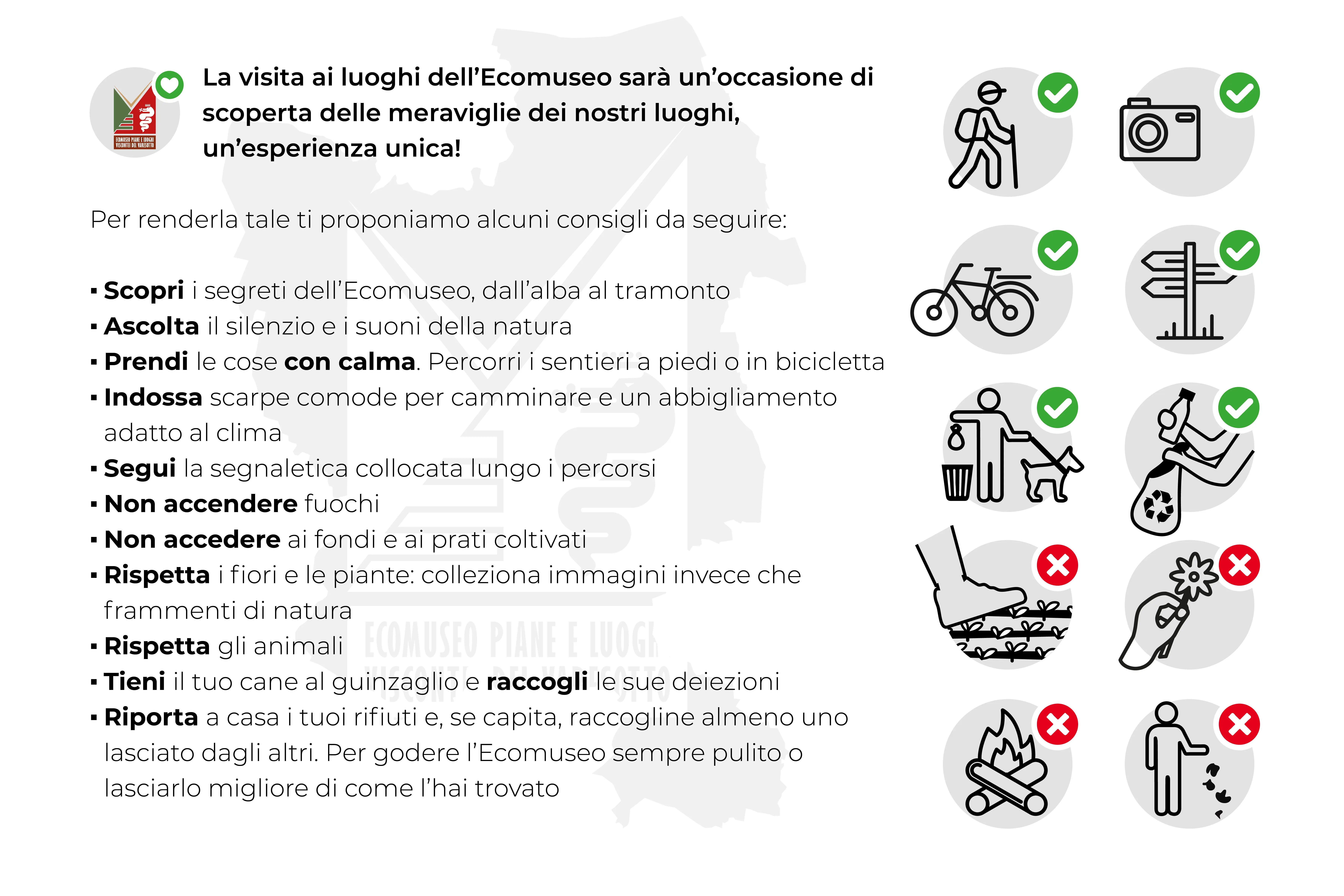 - Riporta a casa i tuoi rifiuti e, se capita, raccogline almeno uno lasciato dagli altri. Per godere l'Ecomuseo sempre pulito o lasciarlo migliore di come l'hai trovato.